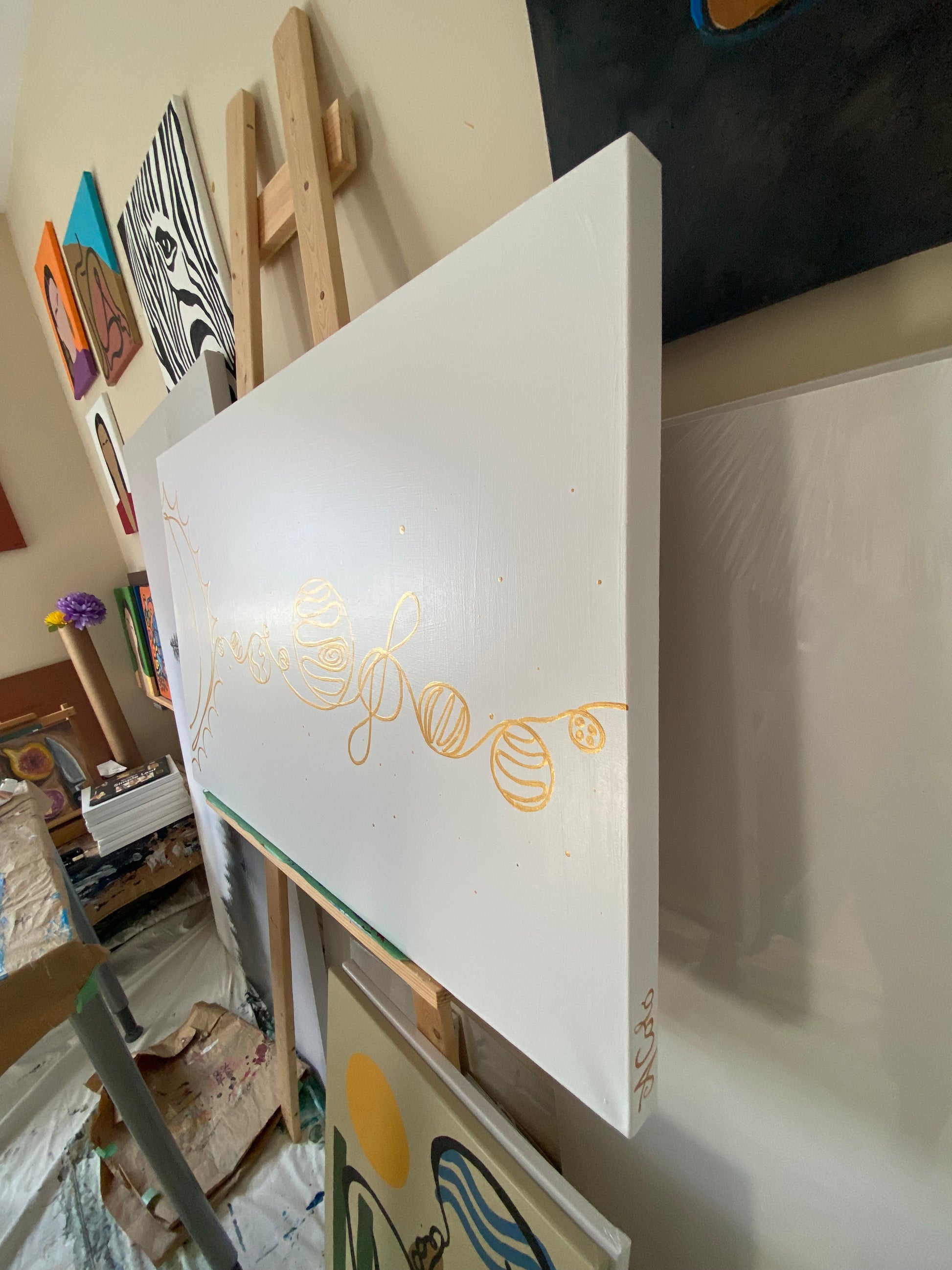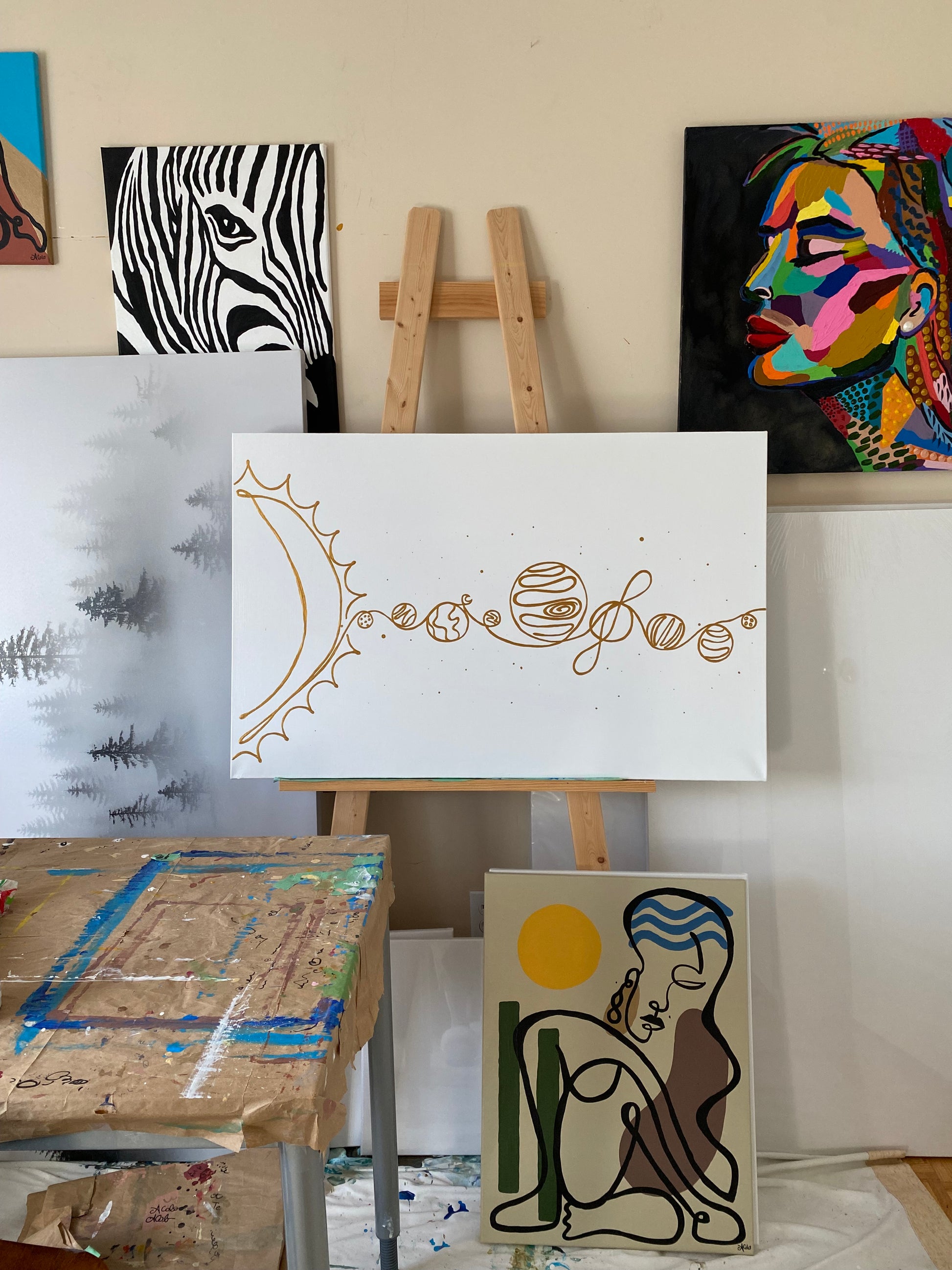 Paintings: 100% cotton canvas, wood frame, acrylic paint.
