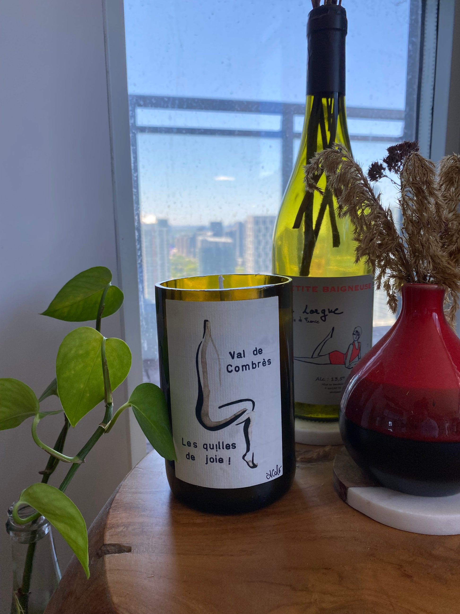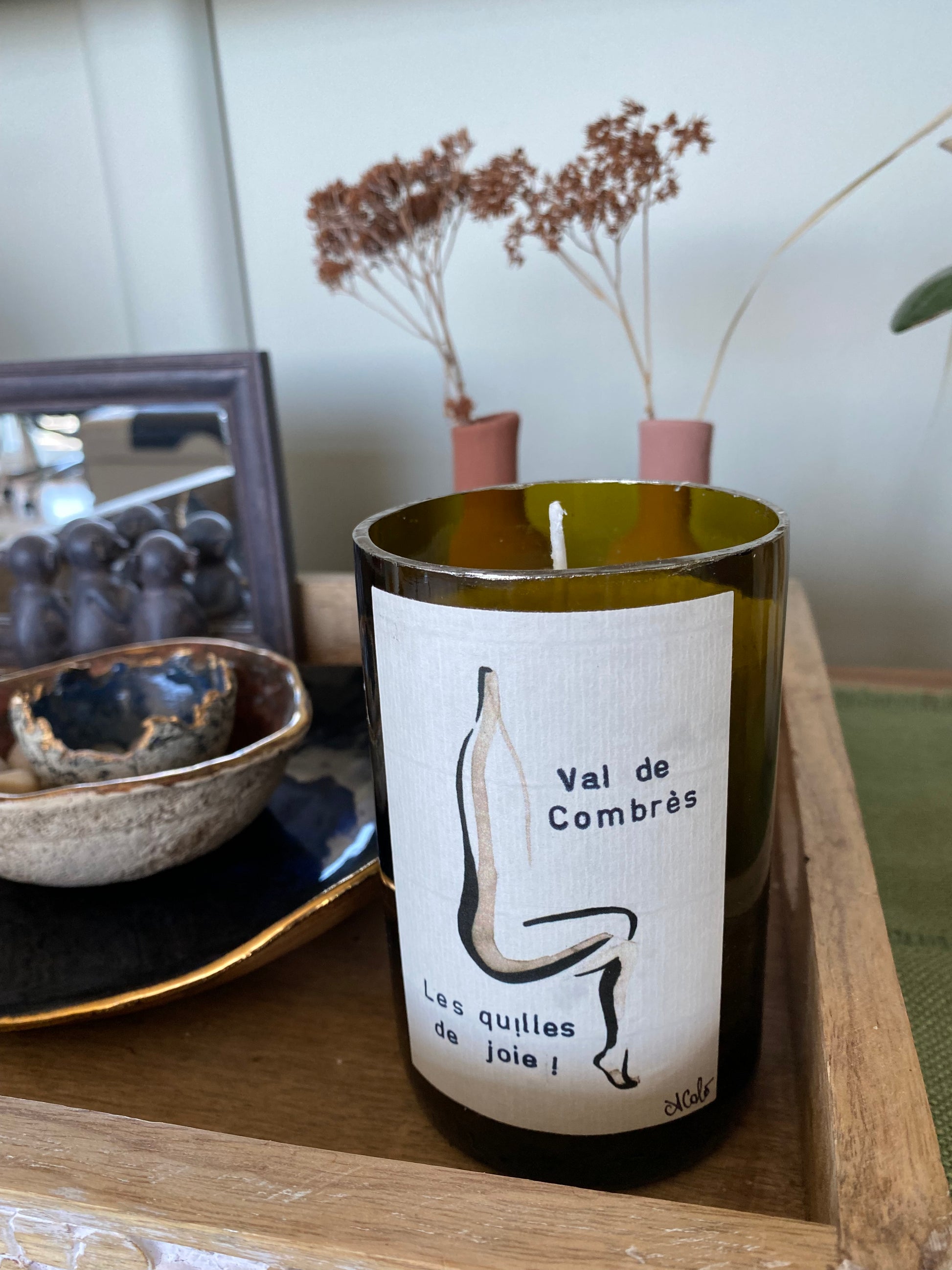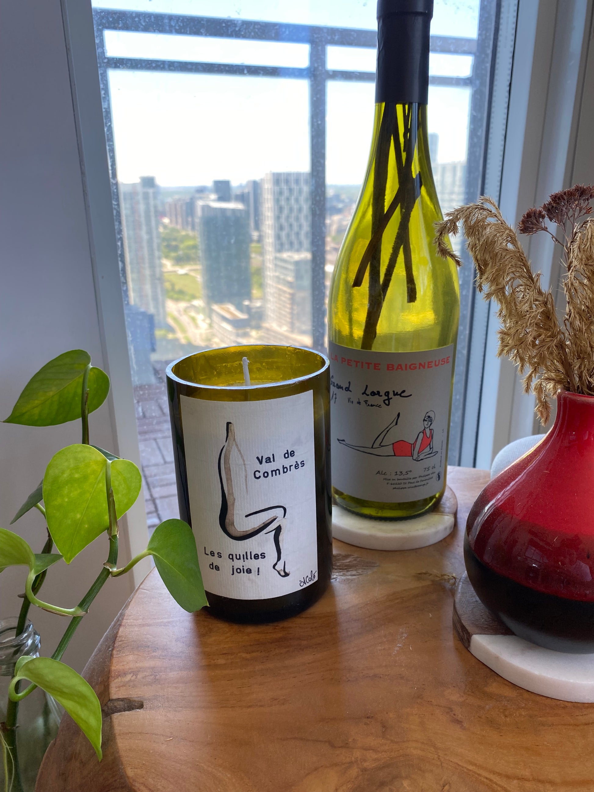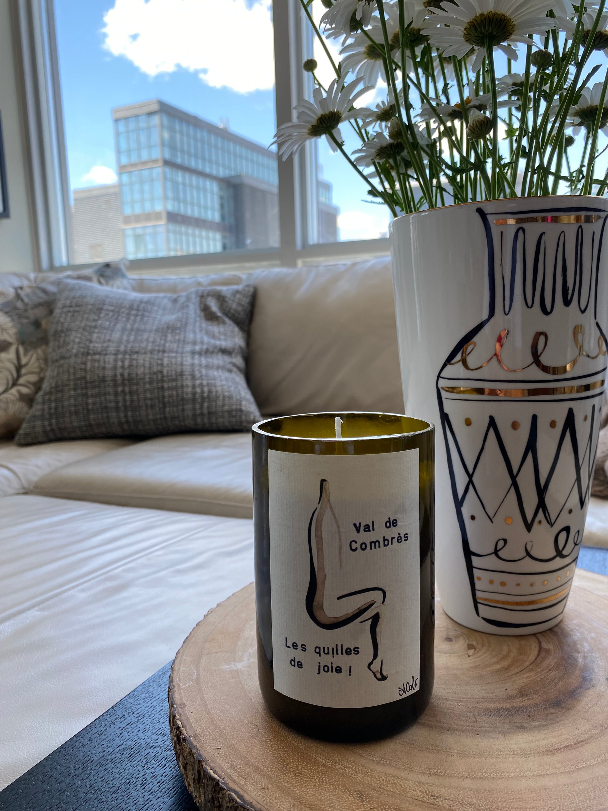 Candles: Natural soy or ice palm wax in a glass wine bottle