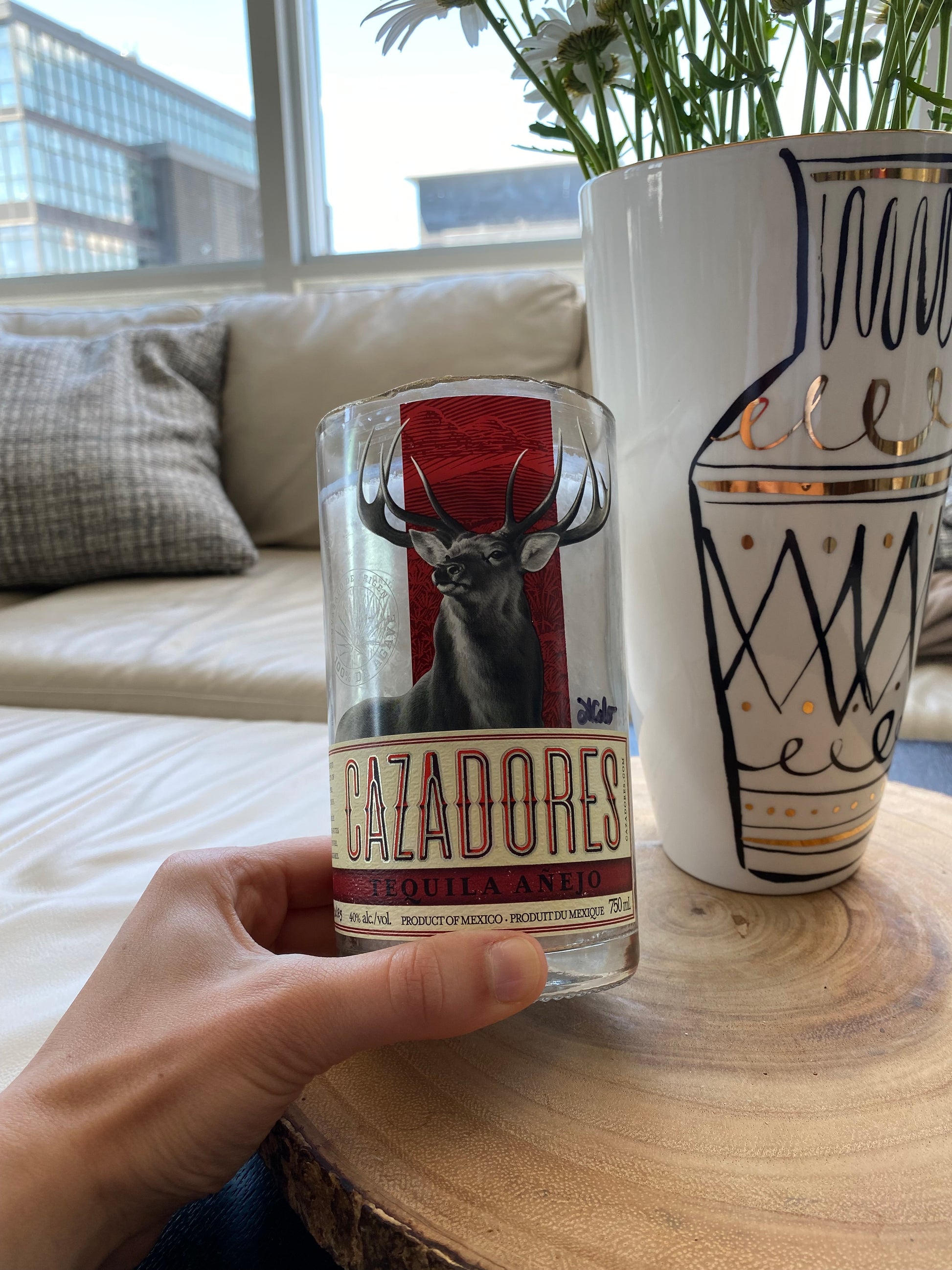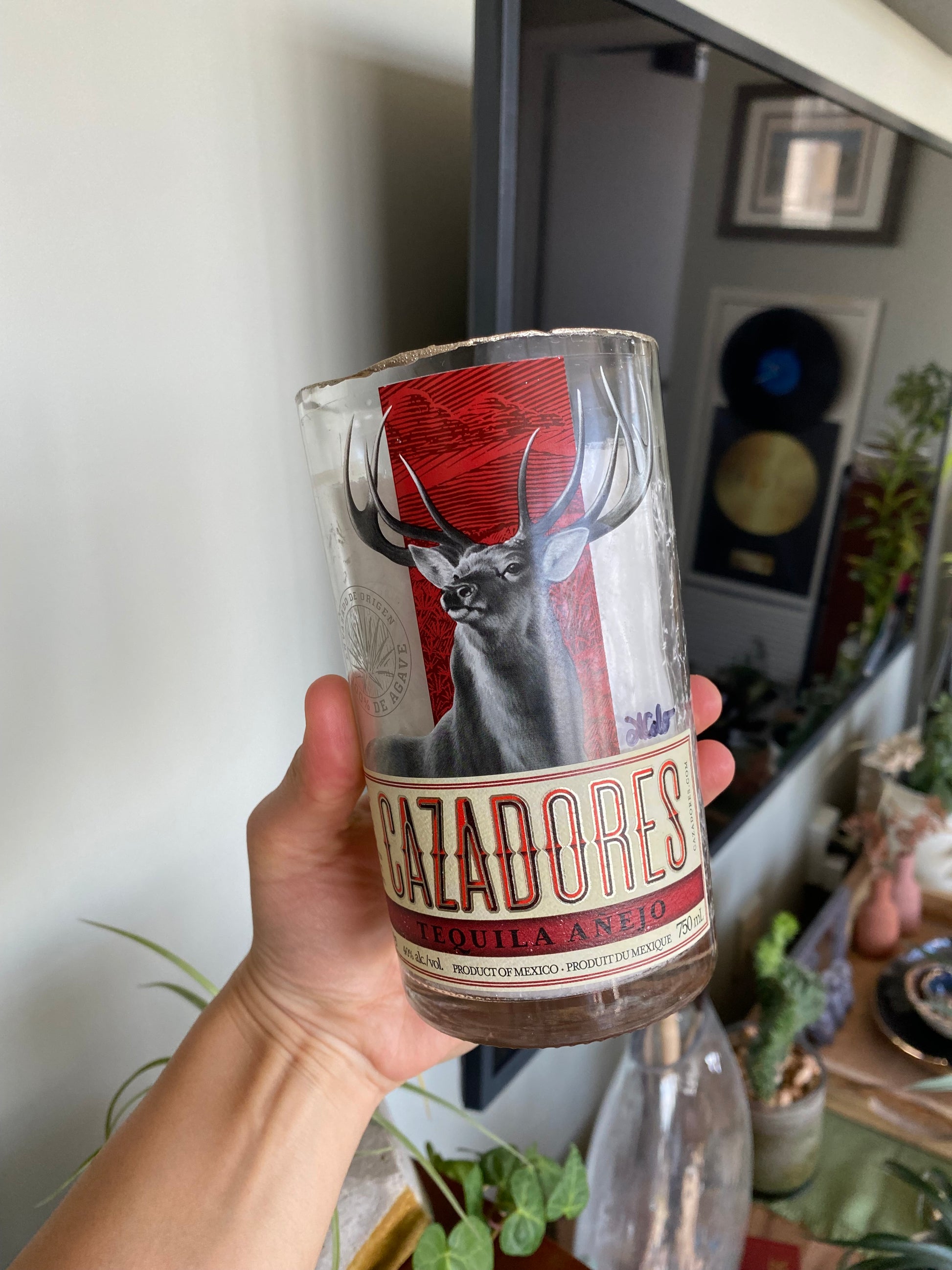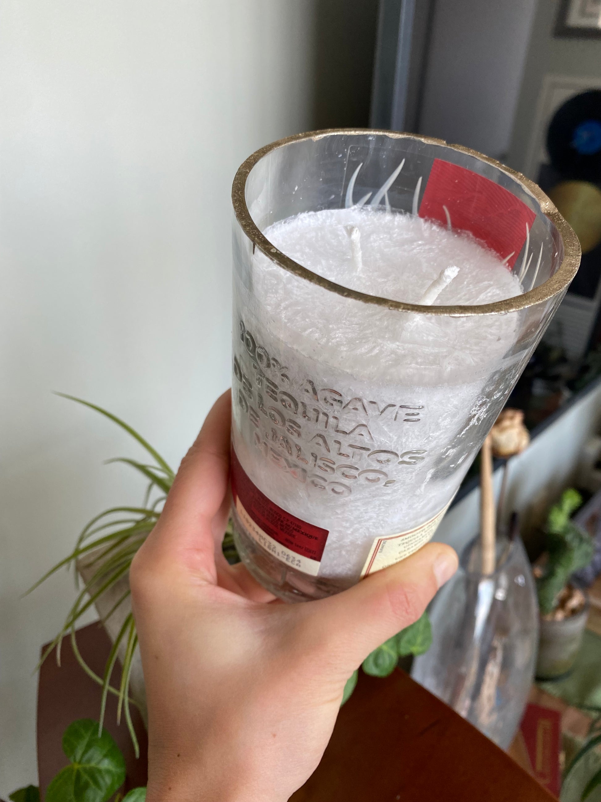 The 'Gazadores' tequila bottle candle is made with ice palm wax for an icy look and feel through the clear glass. Gold rimmed, 2-wicked, and a honestly a hefty large candle!
