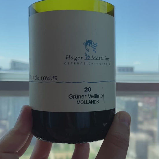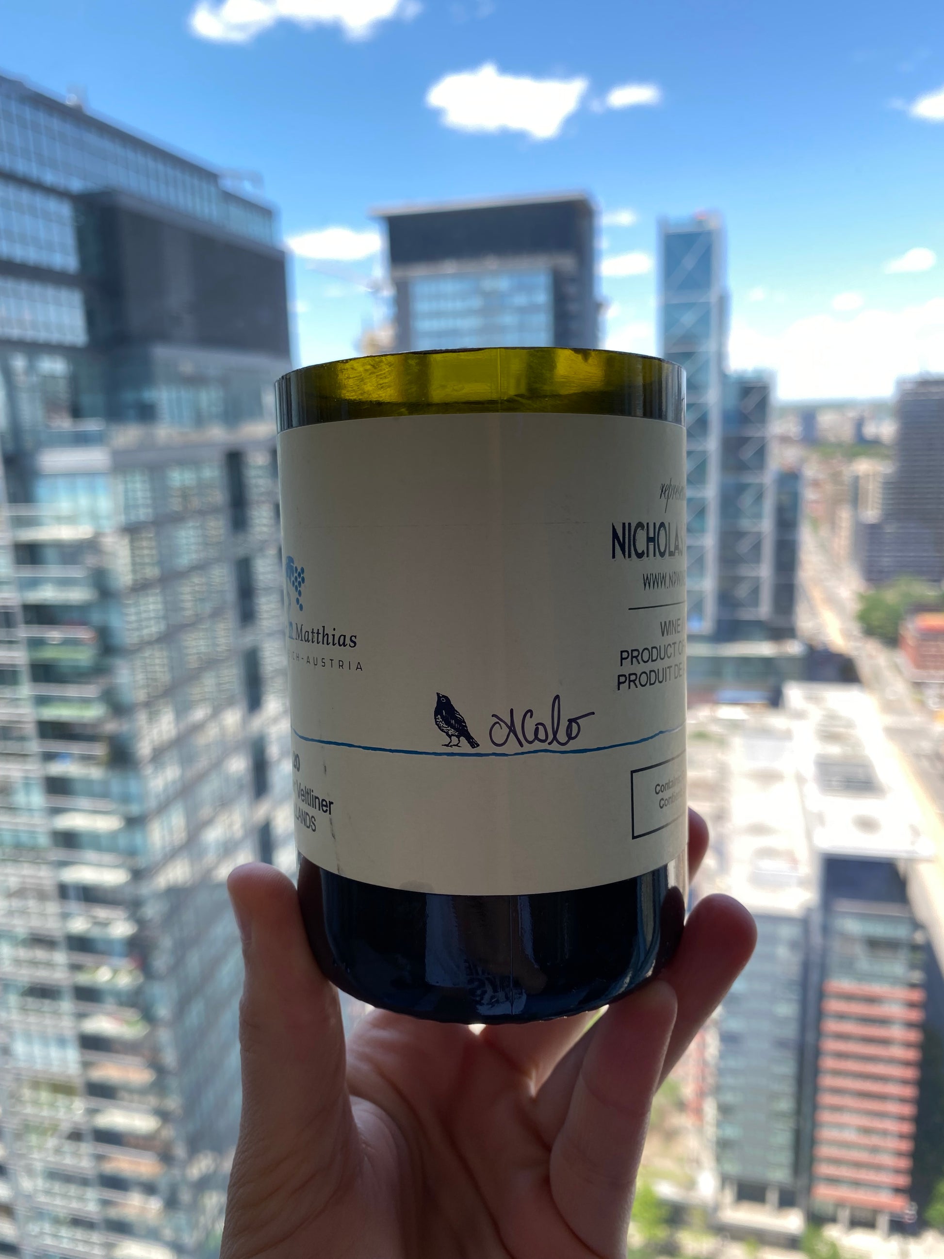 The 'Bird on a Wire' Austrian wine bottle 2-wick candle is made with all natural soy wax. Gold rimmed with a light honey scent. It's the single bird on a wire for me.