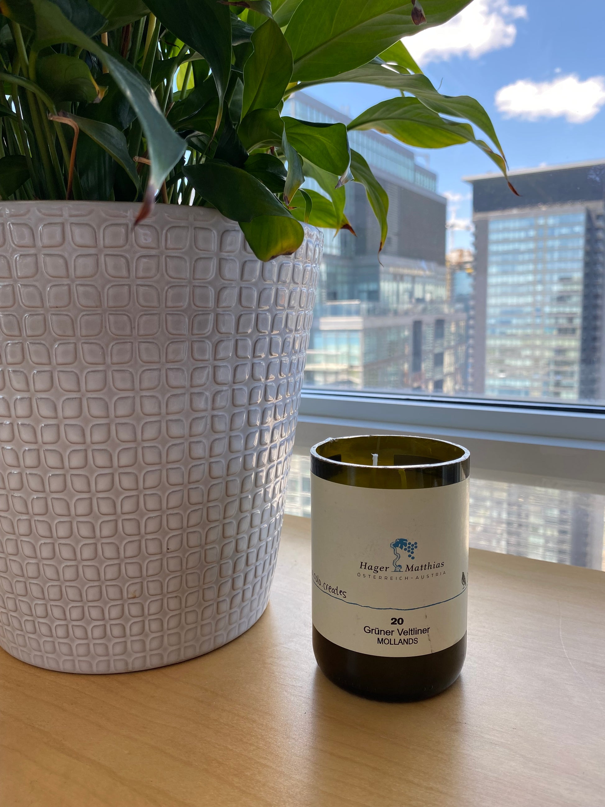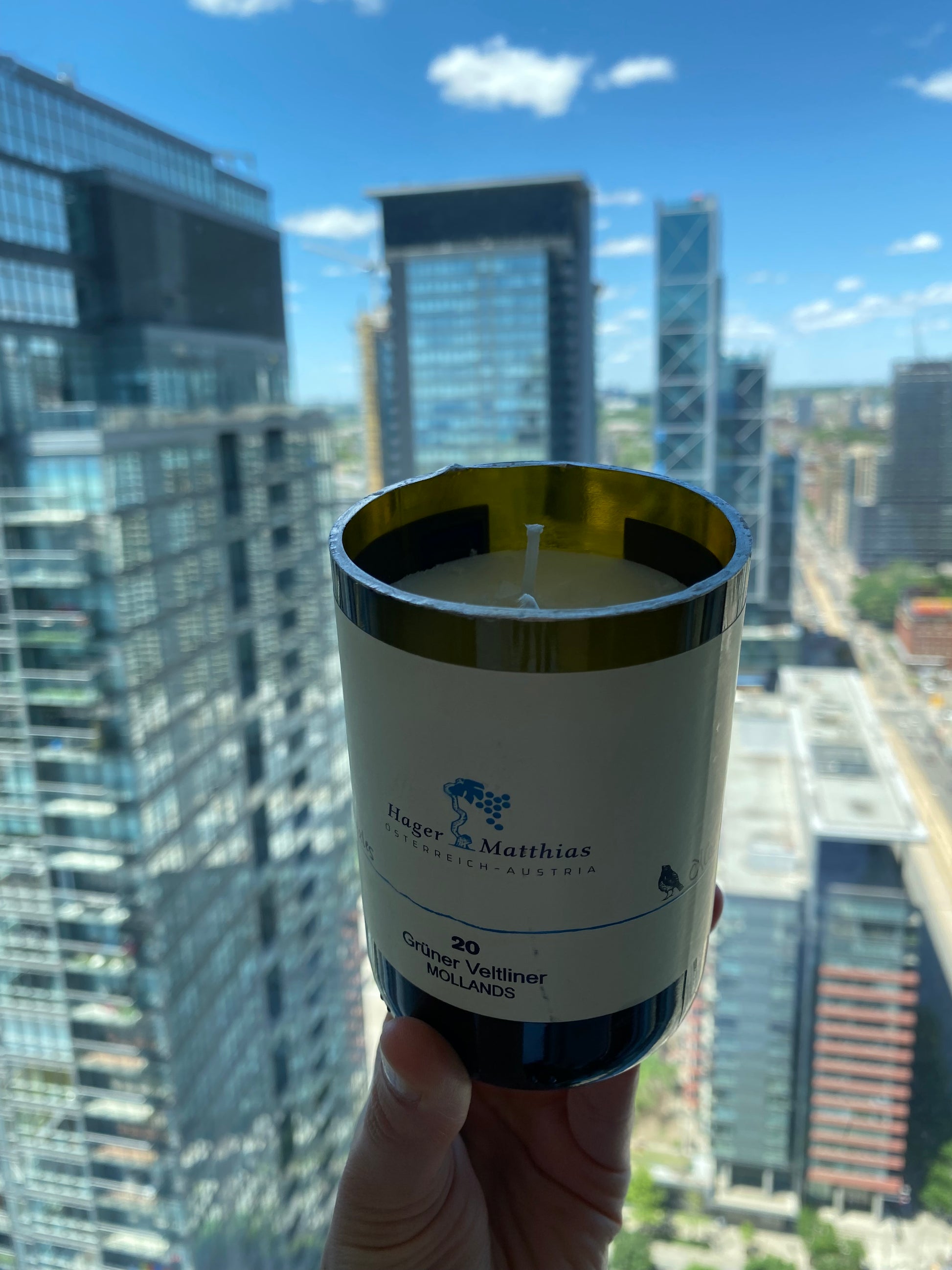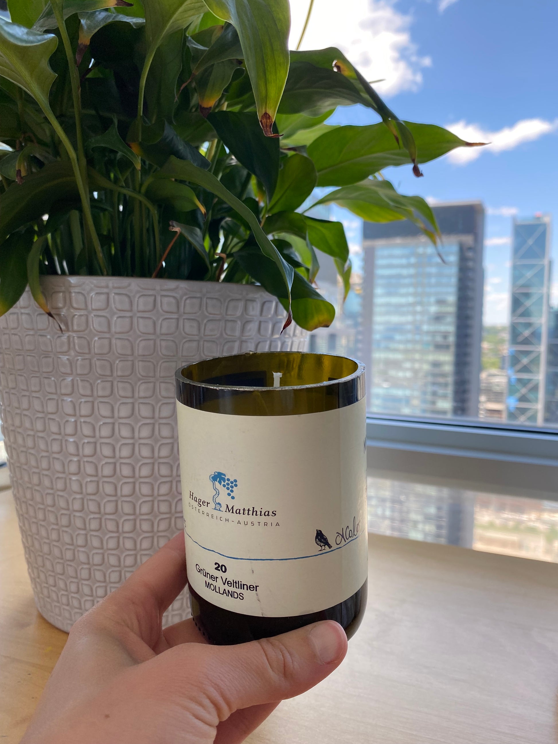 Candles: Natural soy or ice palm wax in a glass wine bottle