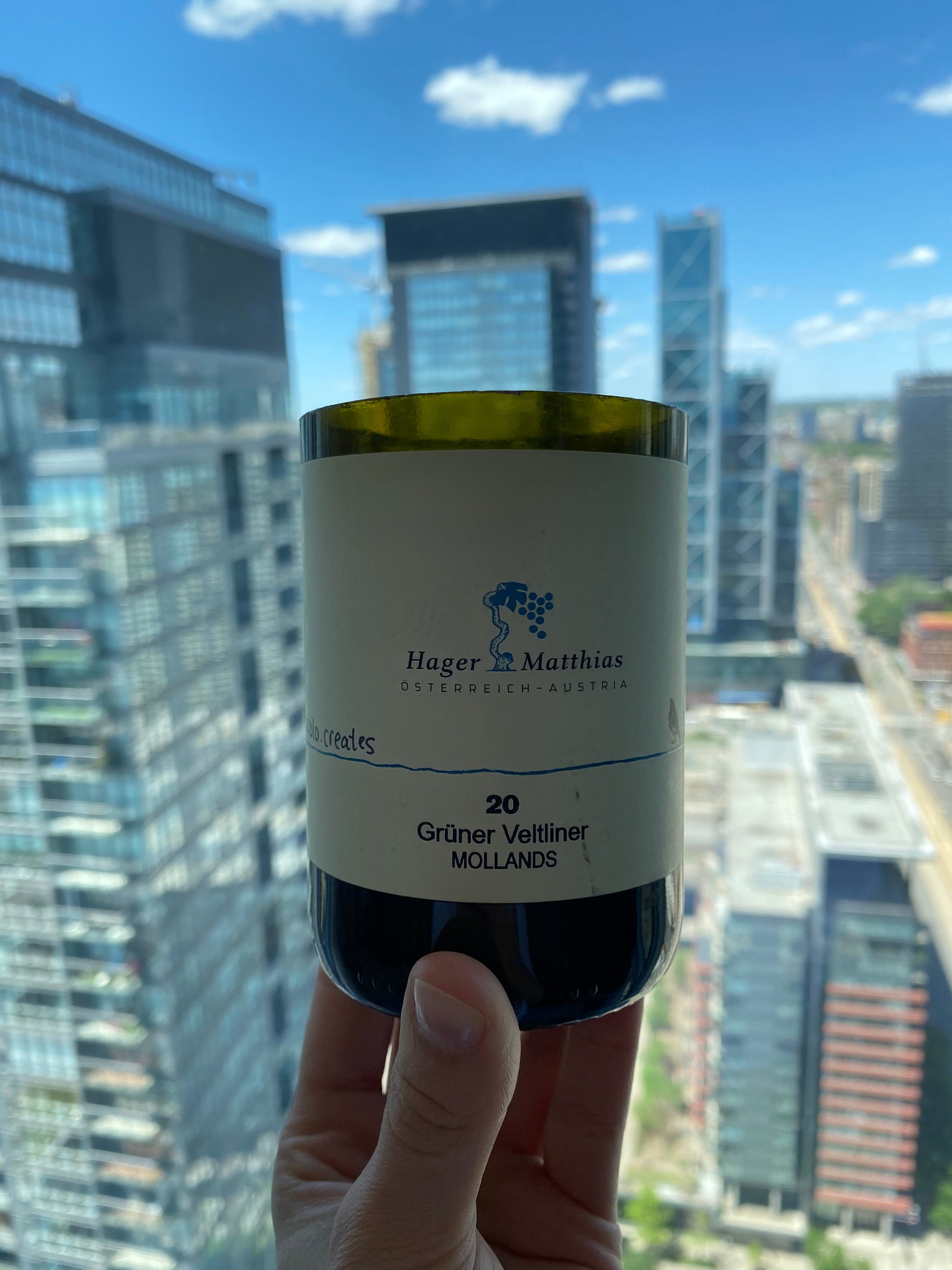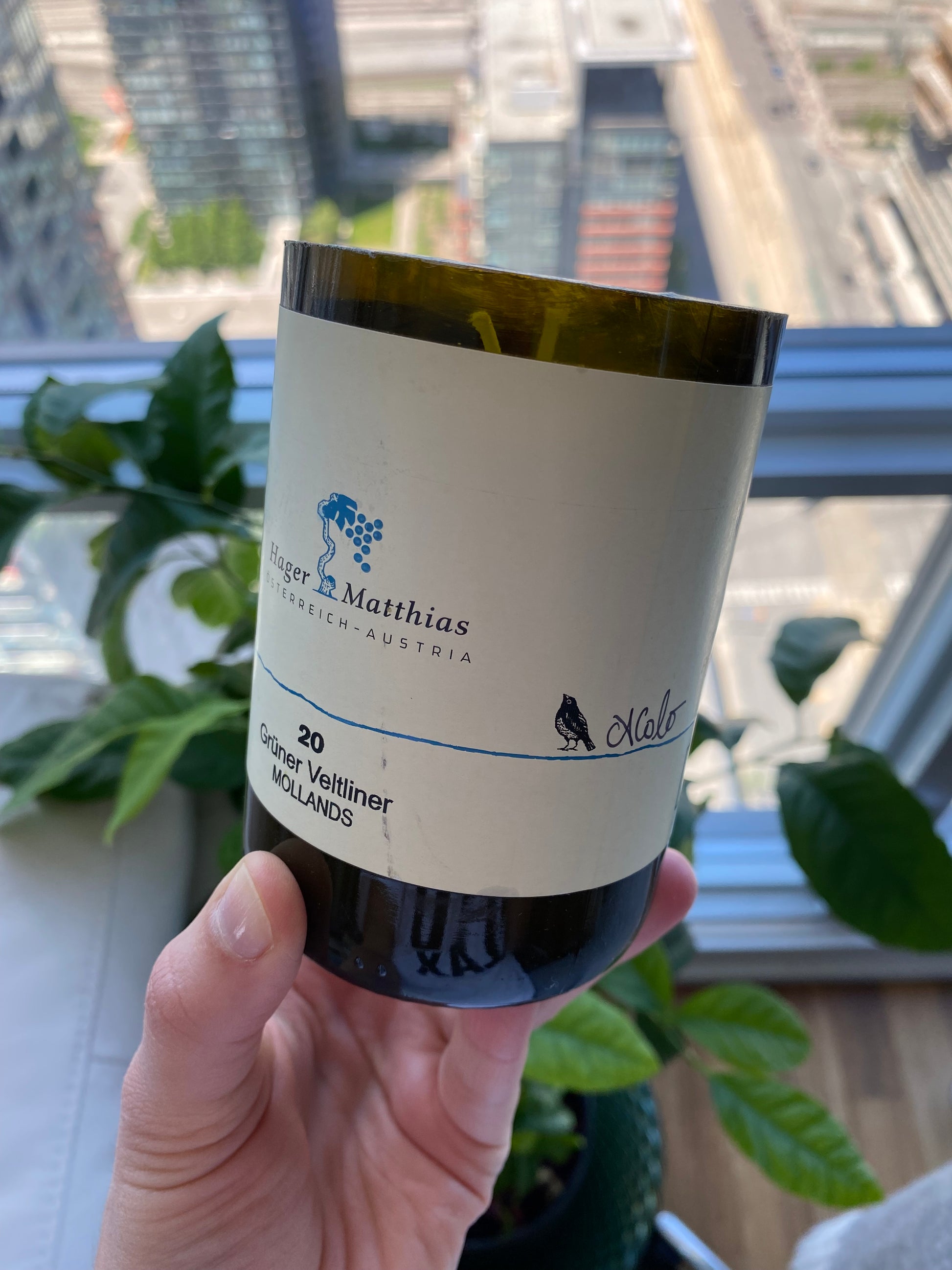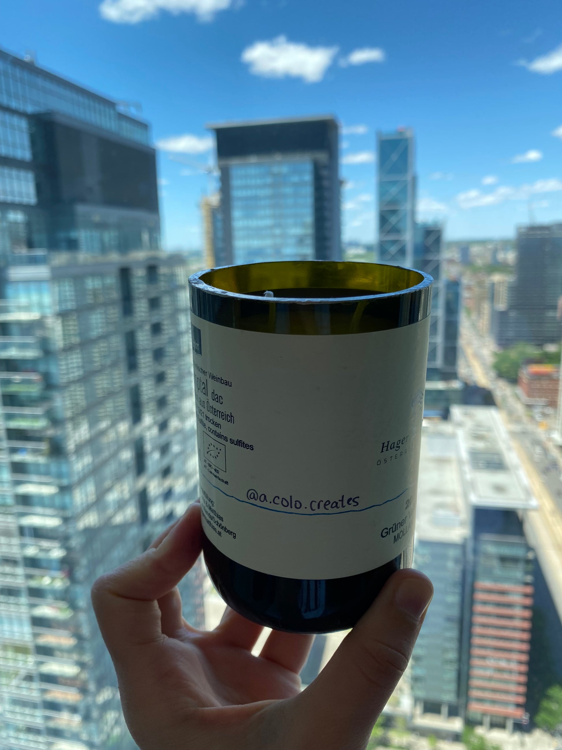 Candles: Natural soy or ice palm wax in a glass wine bottle