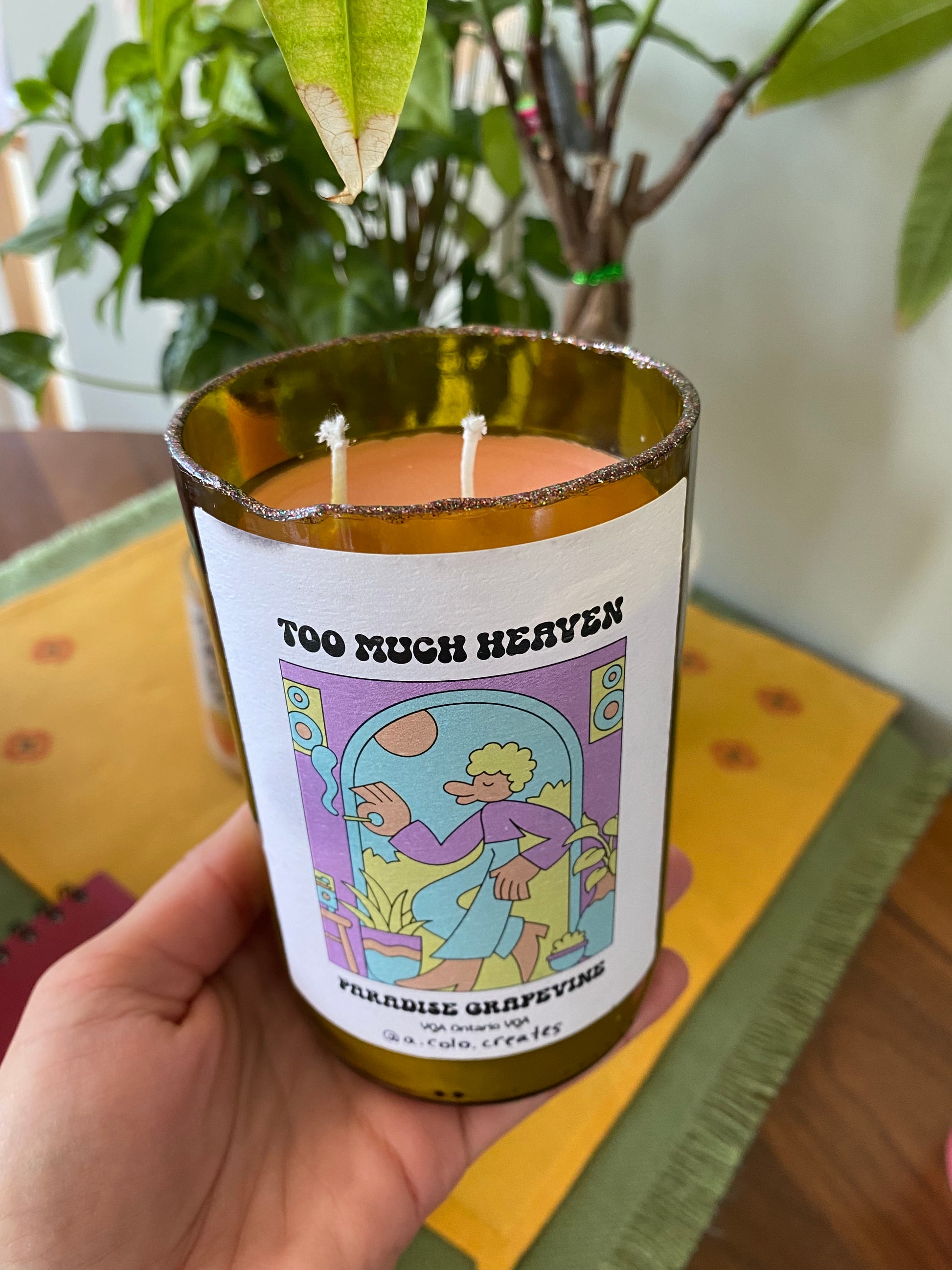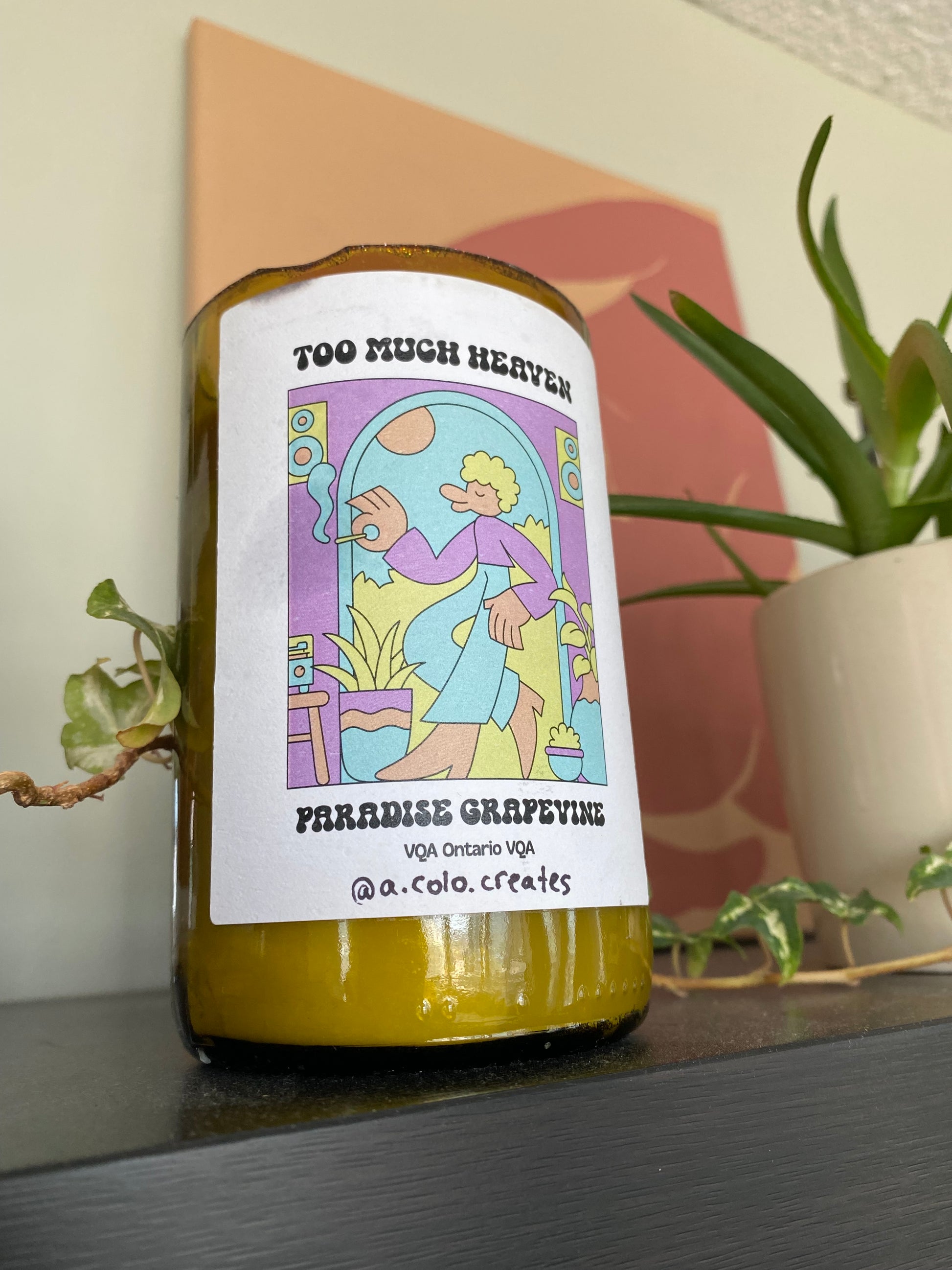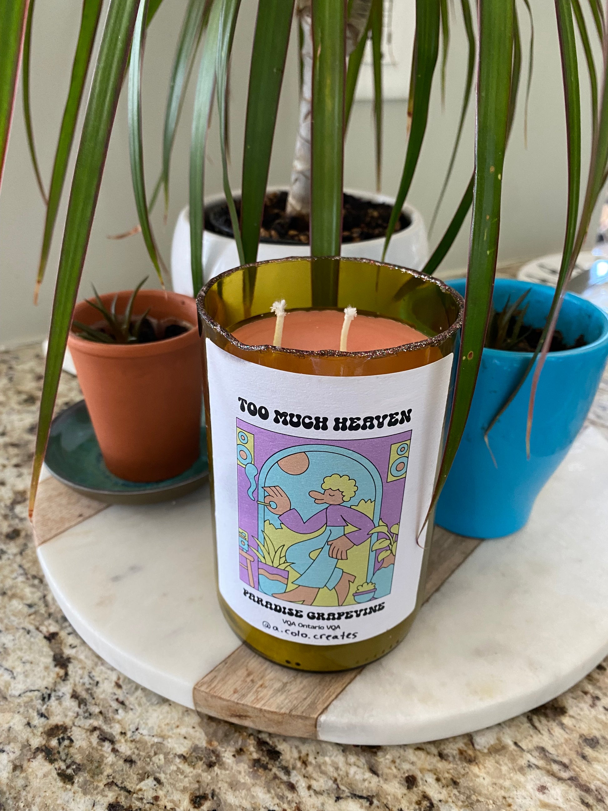 This funky Paradise Grapevine 'Too Much Heaven' wine bottle 2-wick candle is made with natural soy wax. Gold rim, two layer coloured wax, and a light lavender scent. Super groovy all around.