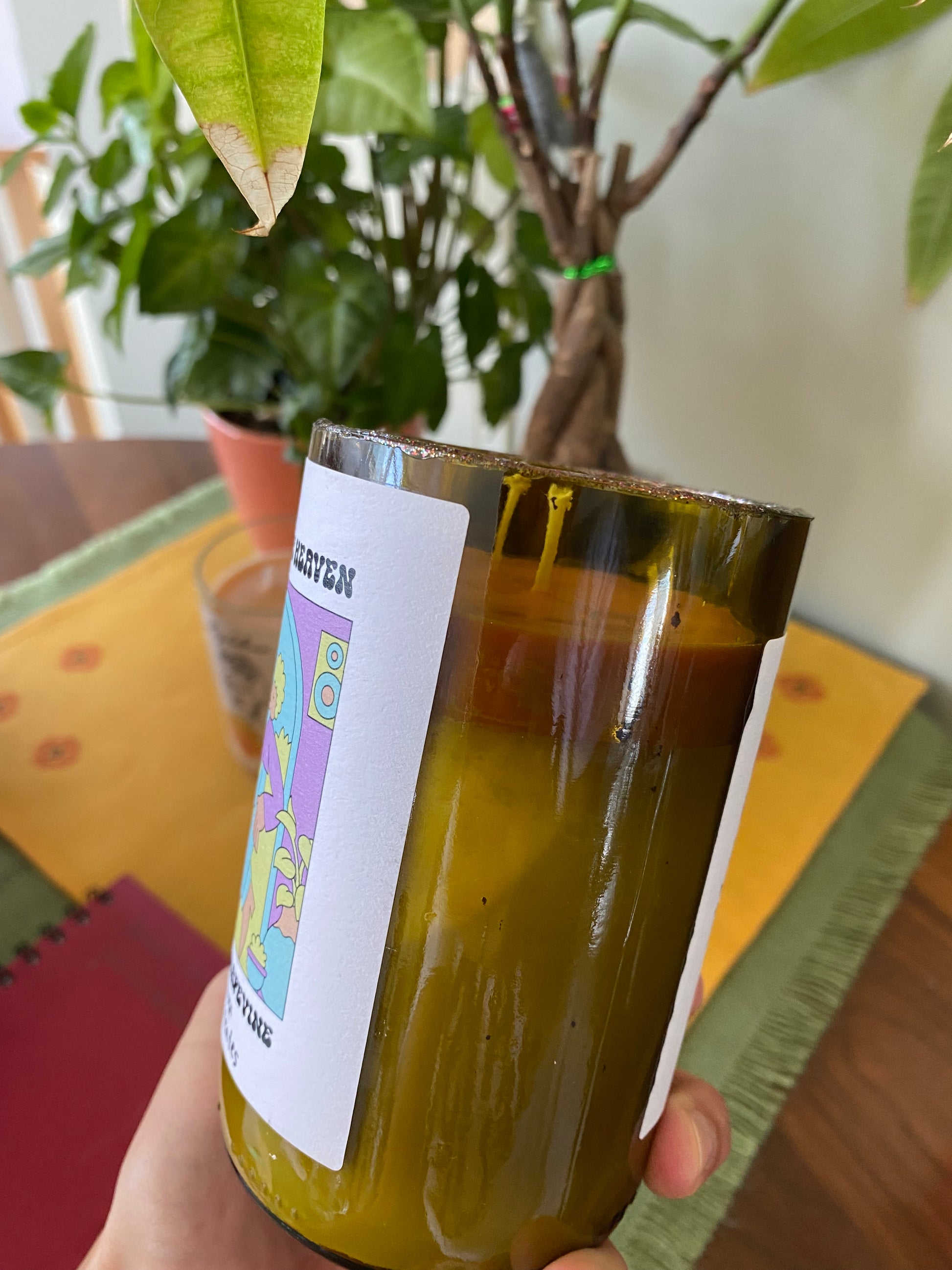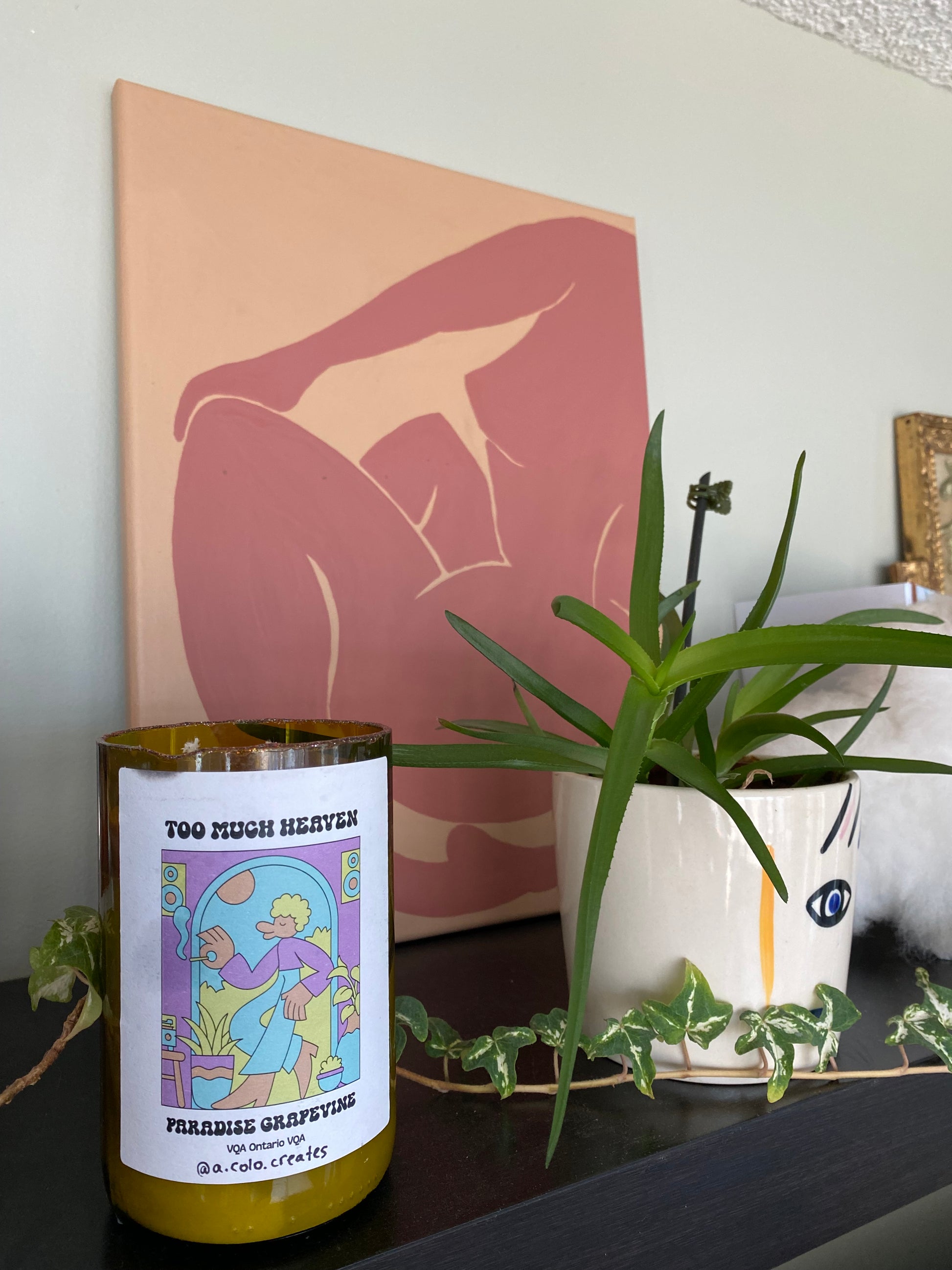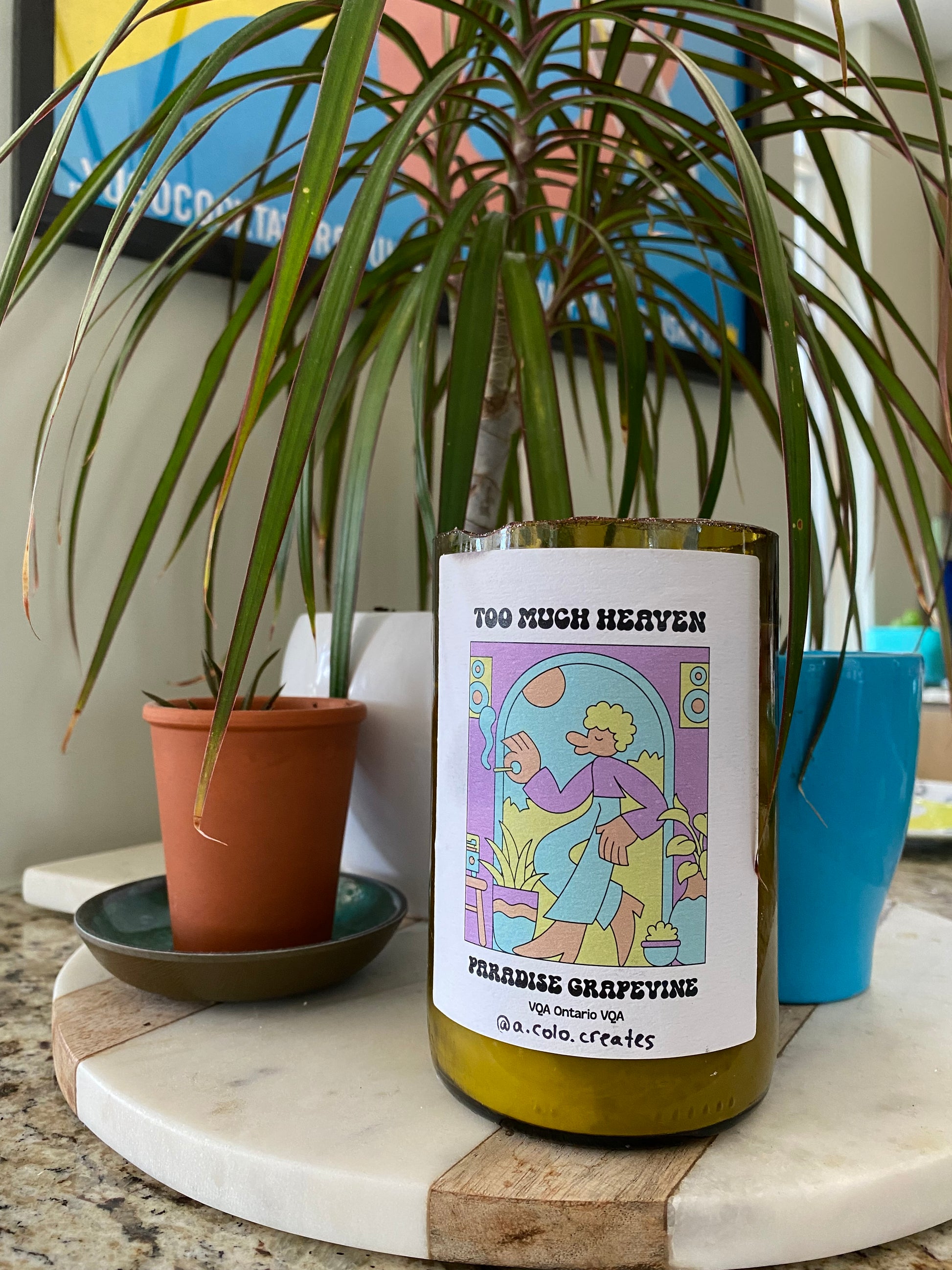 This funky Paradise Grapevine 'Too Much Heaven' wine bottle 2-wick candle is made with natural soy wax. Gold rim, two layer coloured wax, and a light lavender scent. Super groovy all around.