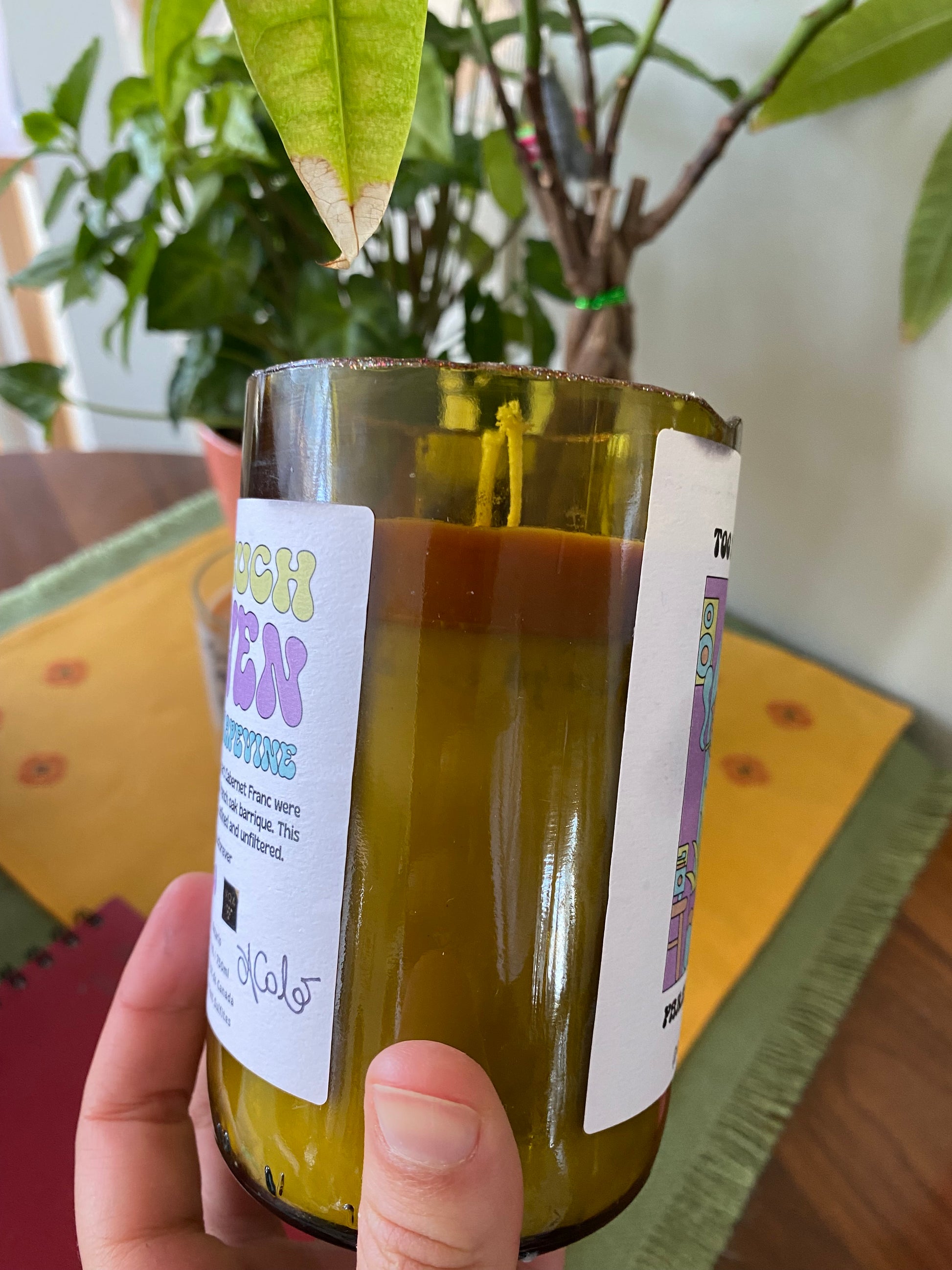 Candles: Natural soy or ice palm wax in a glass wine bottle
