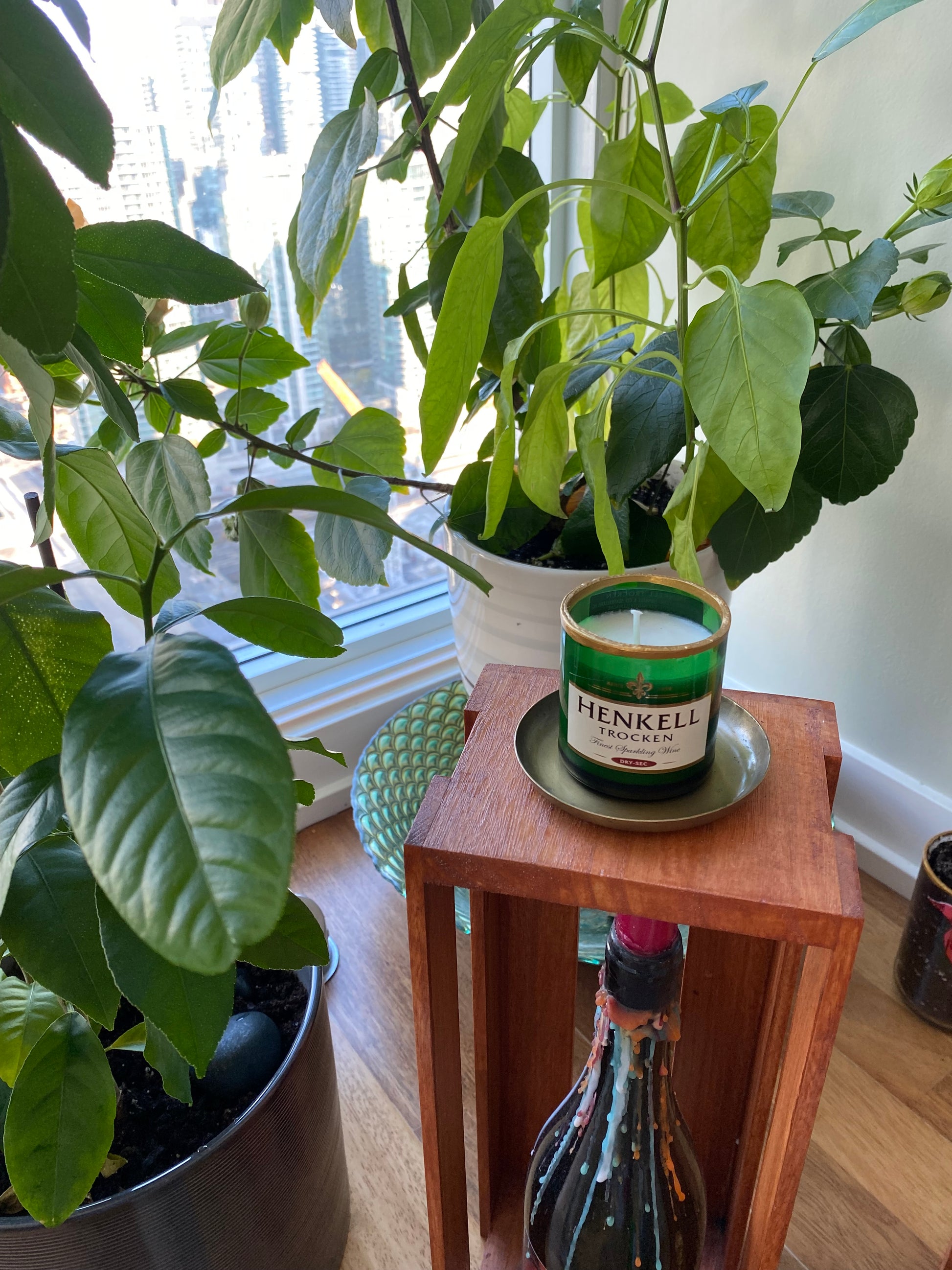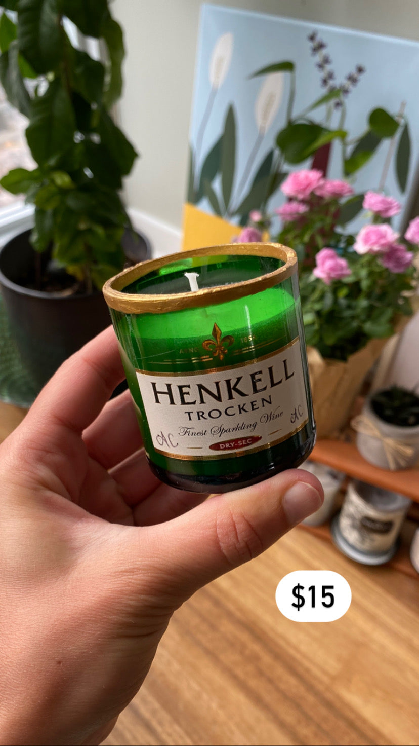 Candles: Natural soy or ice palm wax in a glass wine bottle