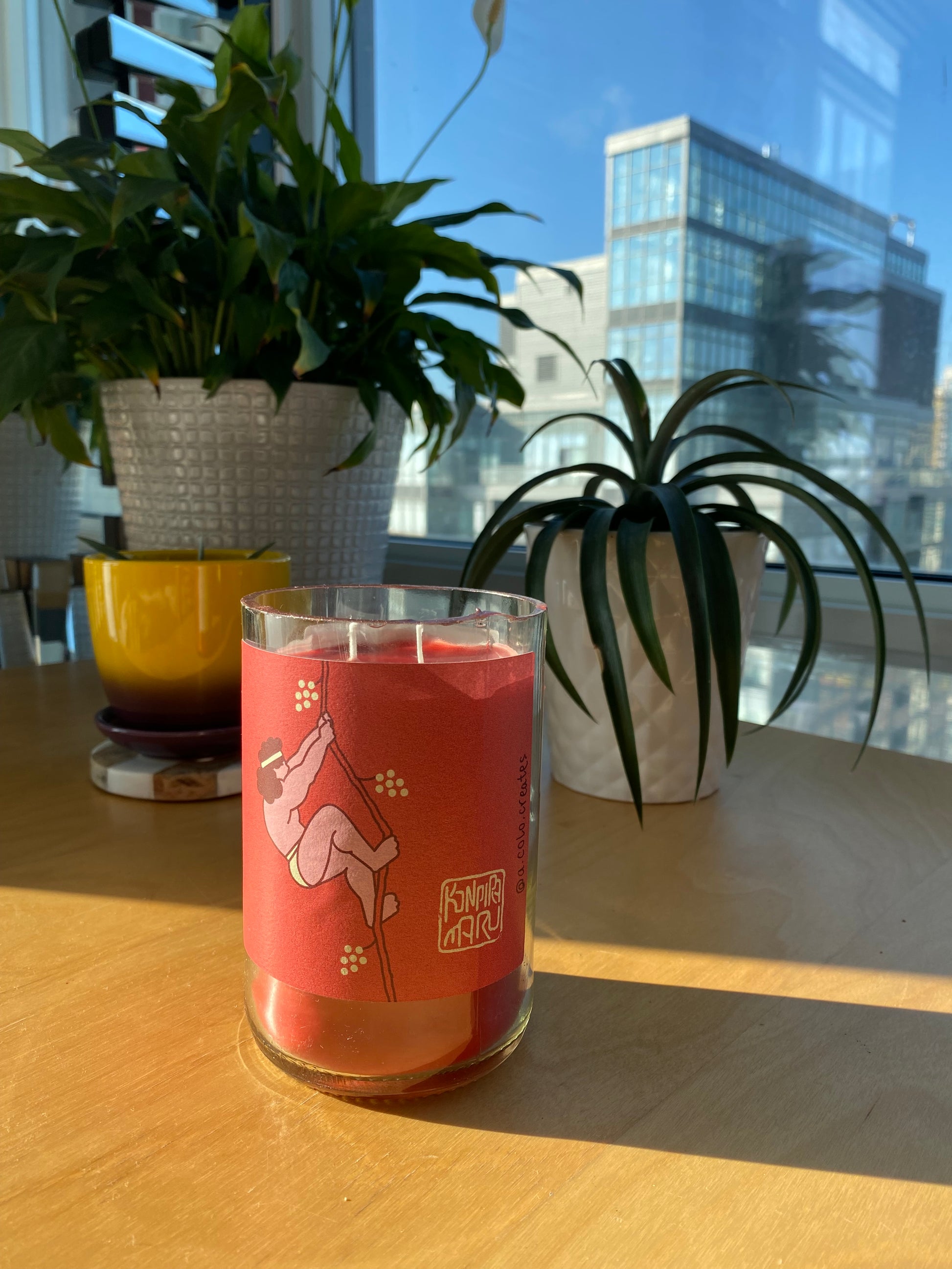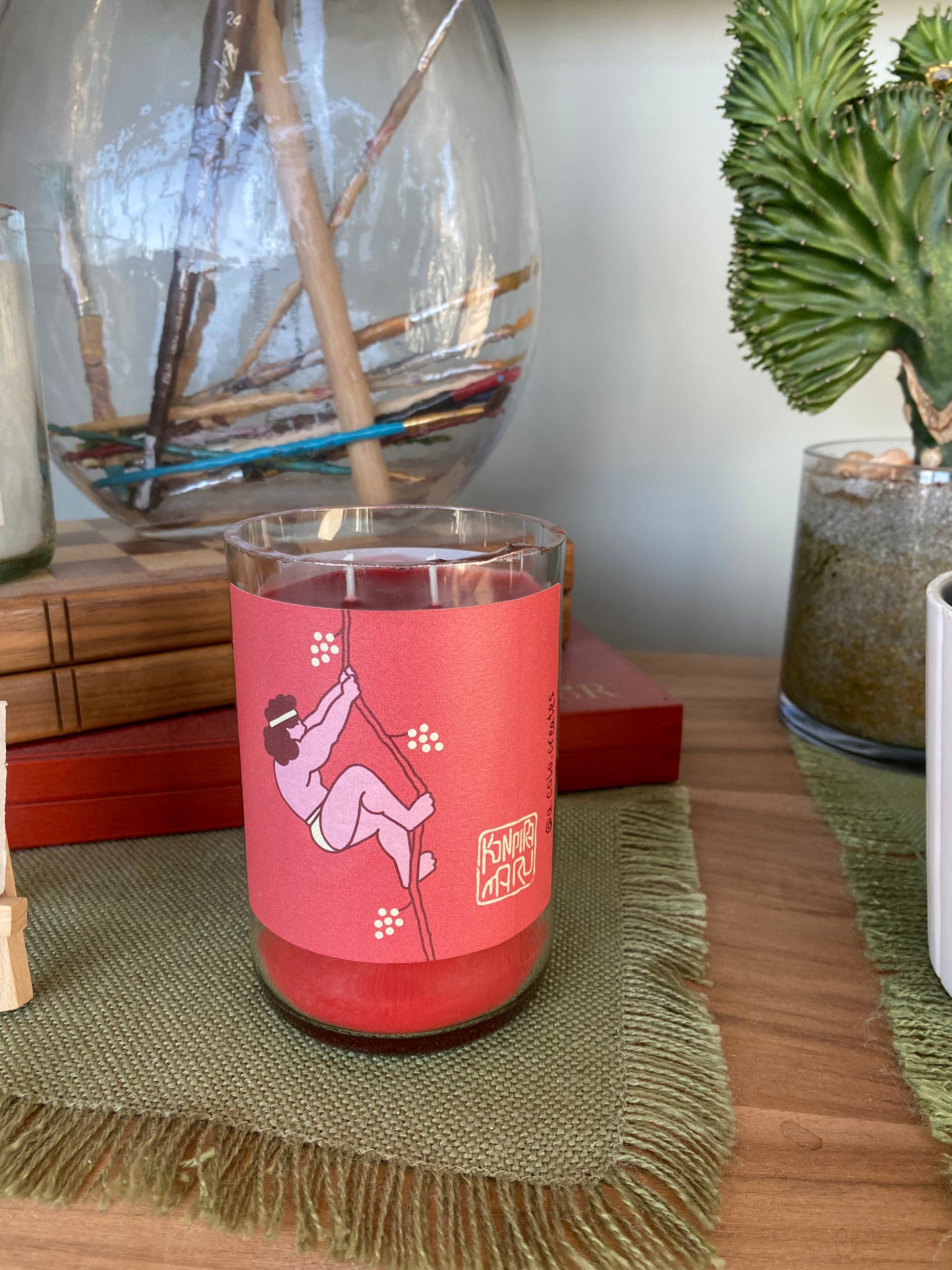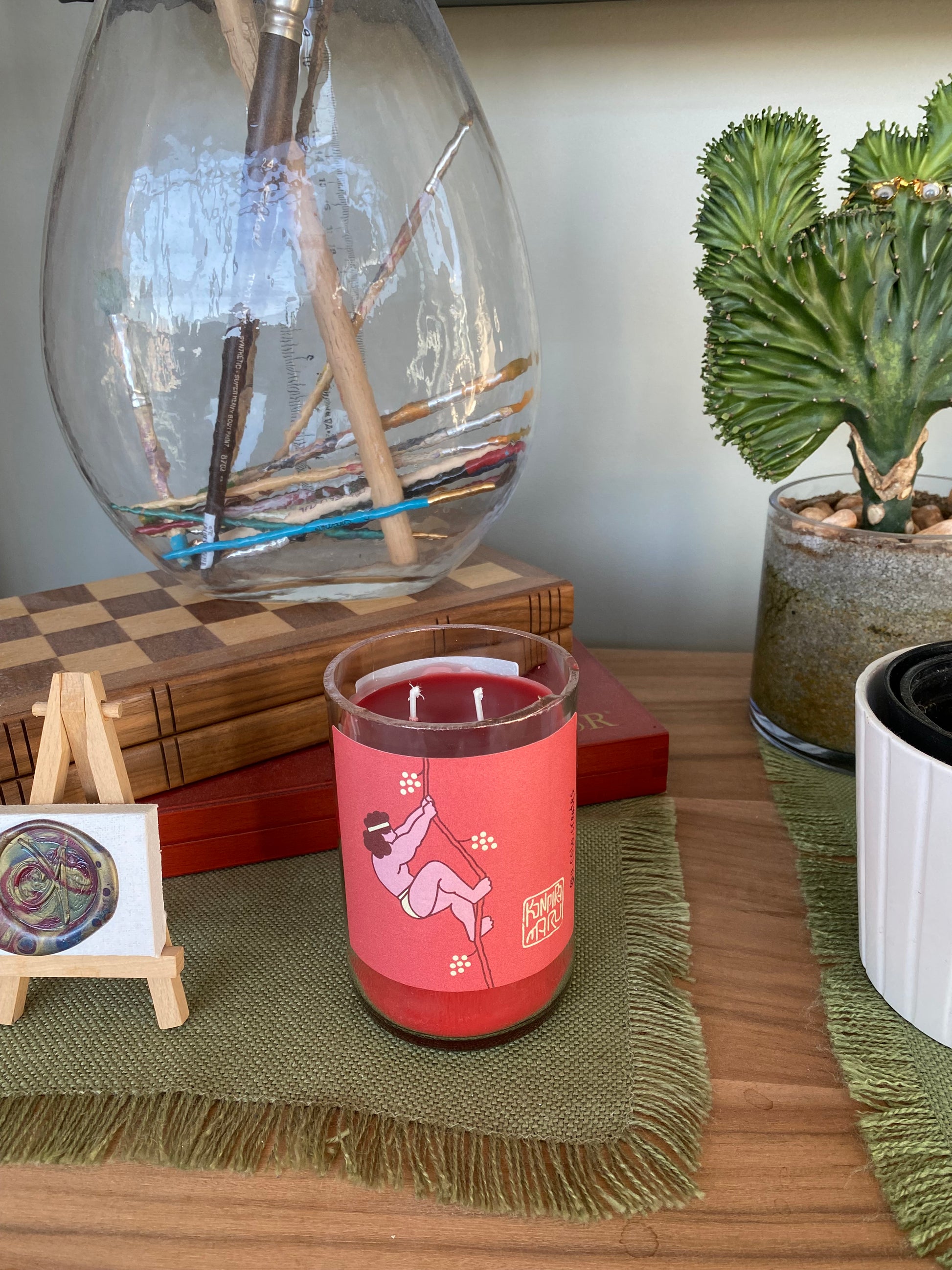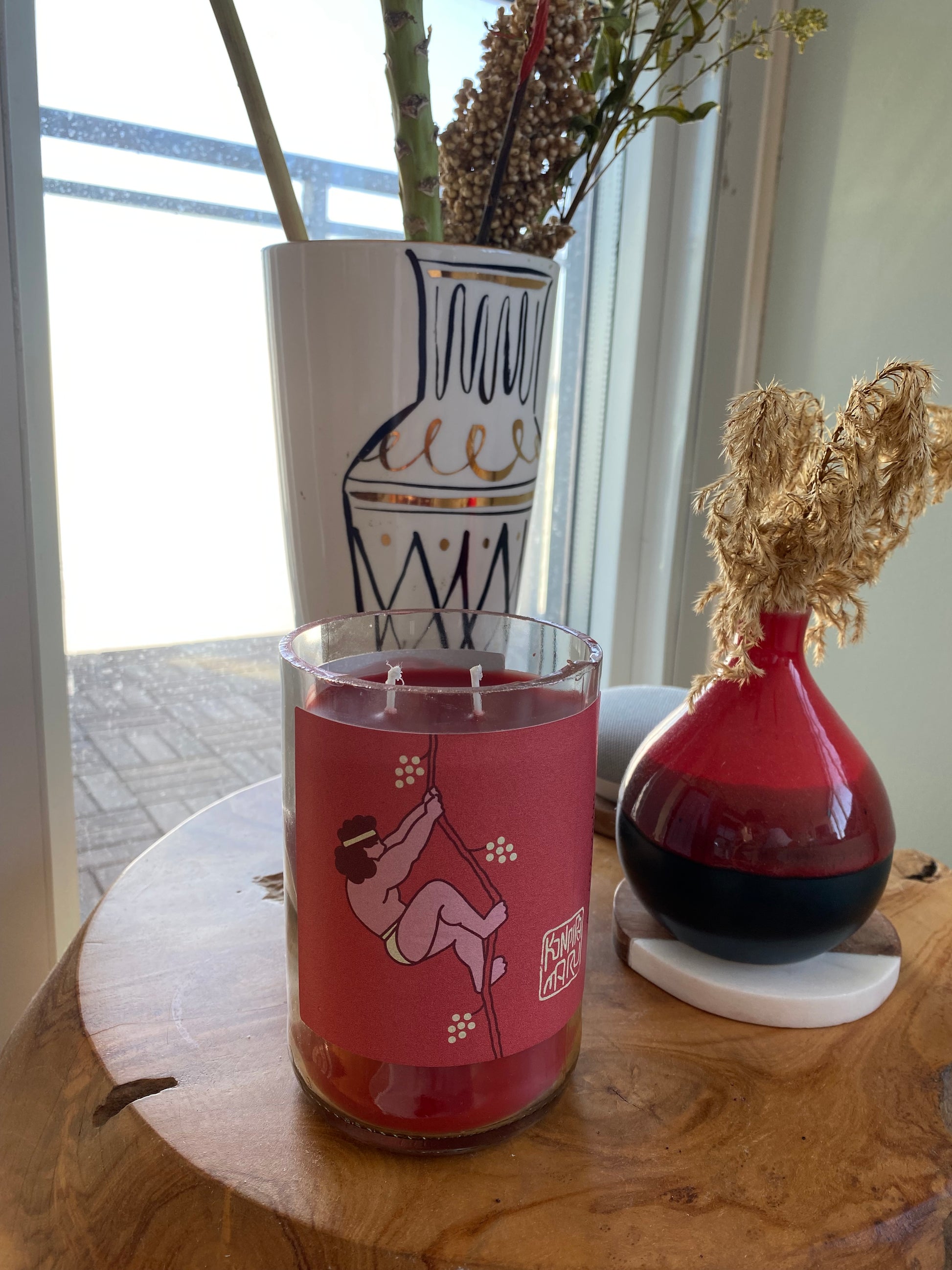 Who doesn't love a strong feminine presence that's elegantly fiery red and burning? This wine bottle is gold rimmed with a red coloured wax around 2 wicks to match the red label. Apple crisp scented - yum.