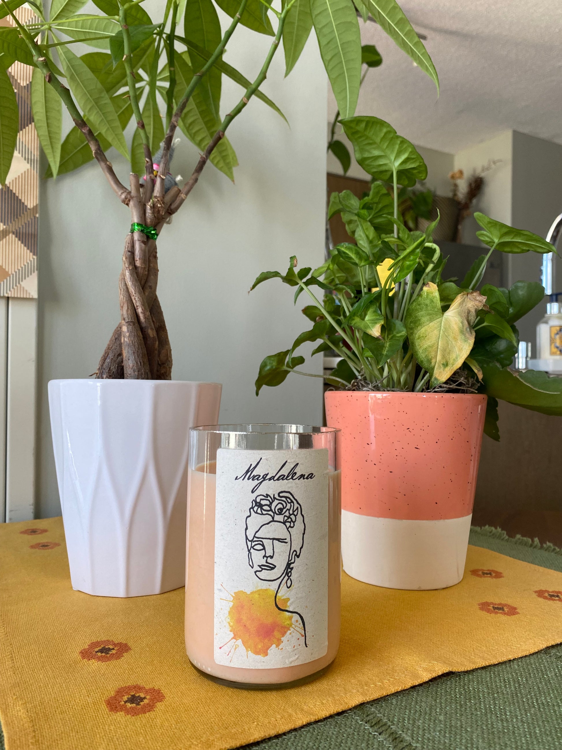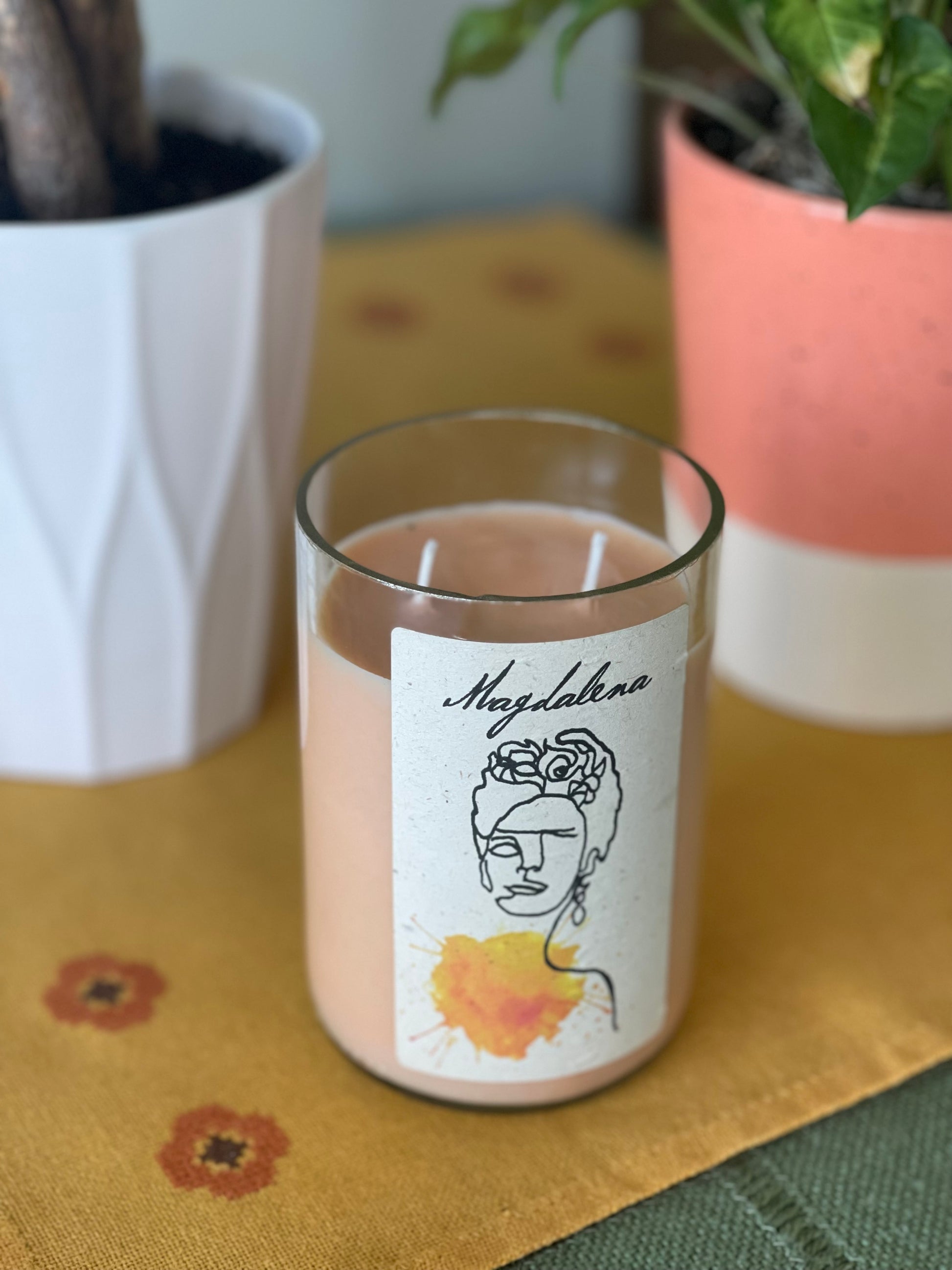 Candles: Natural soy or ice palm wax in a glass wine bottle