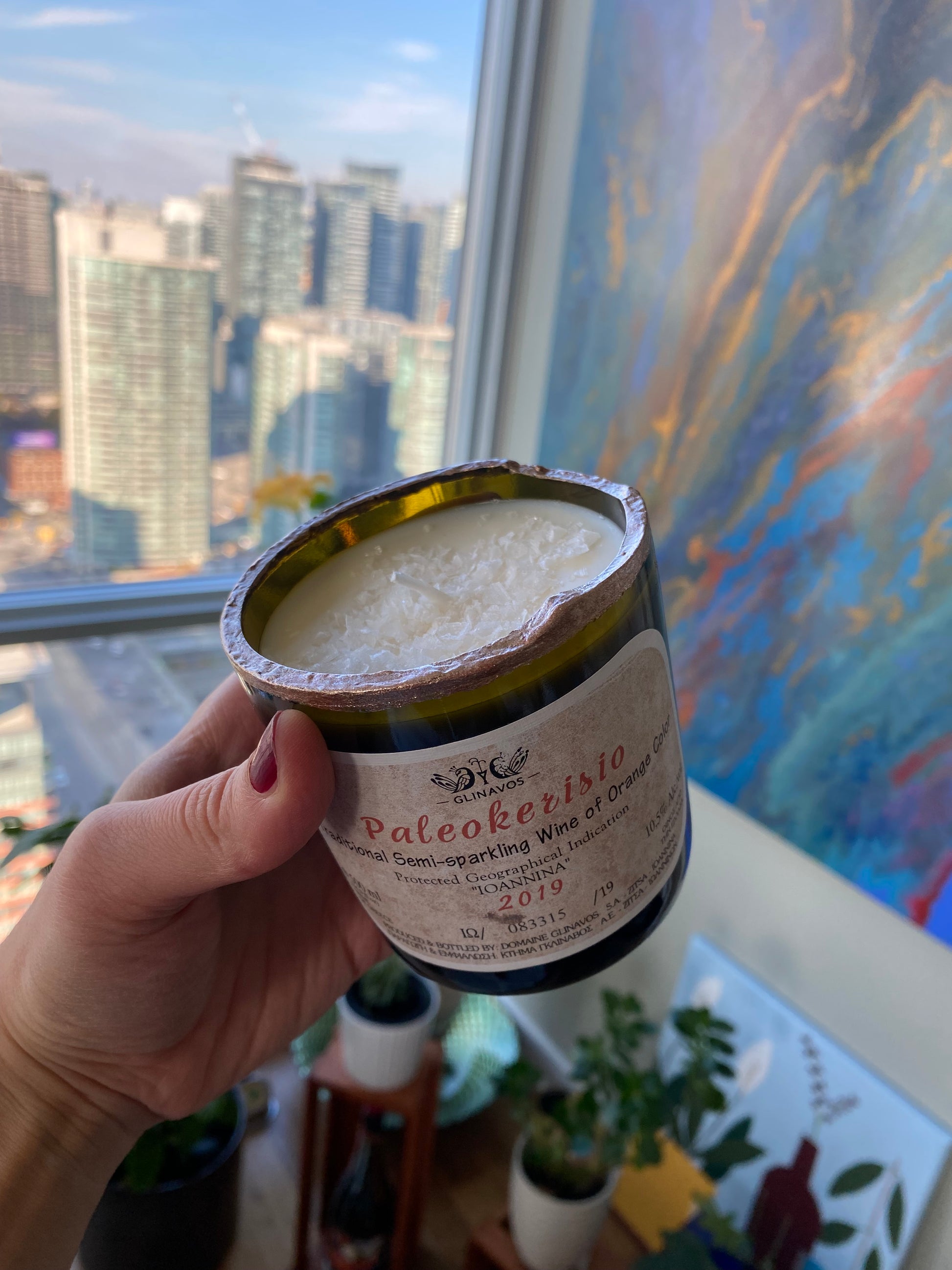 Candles: Natural soy or ice palm wax in a glass wine bottle