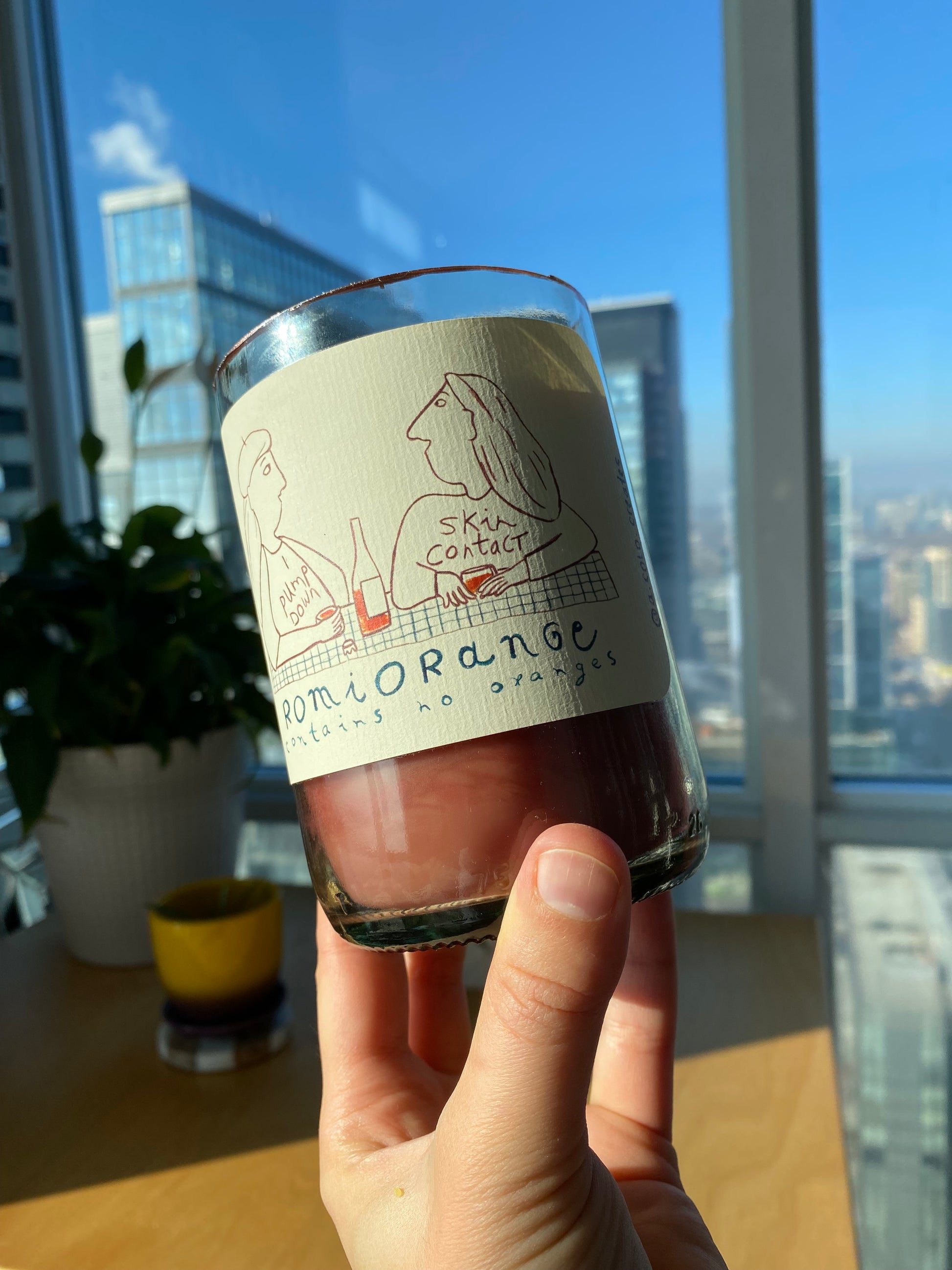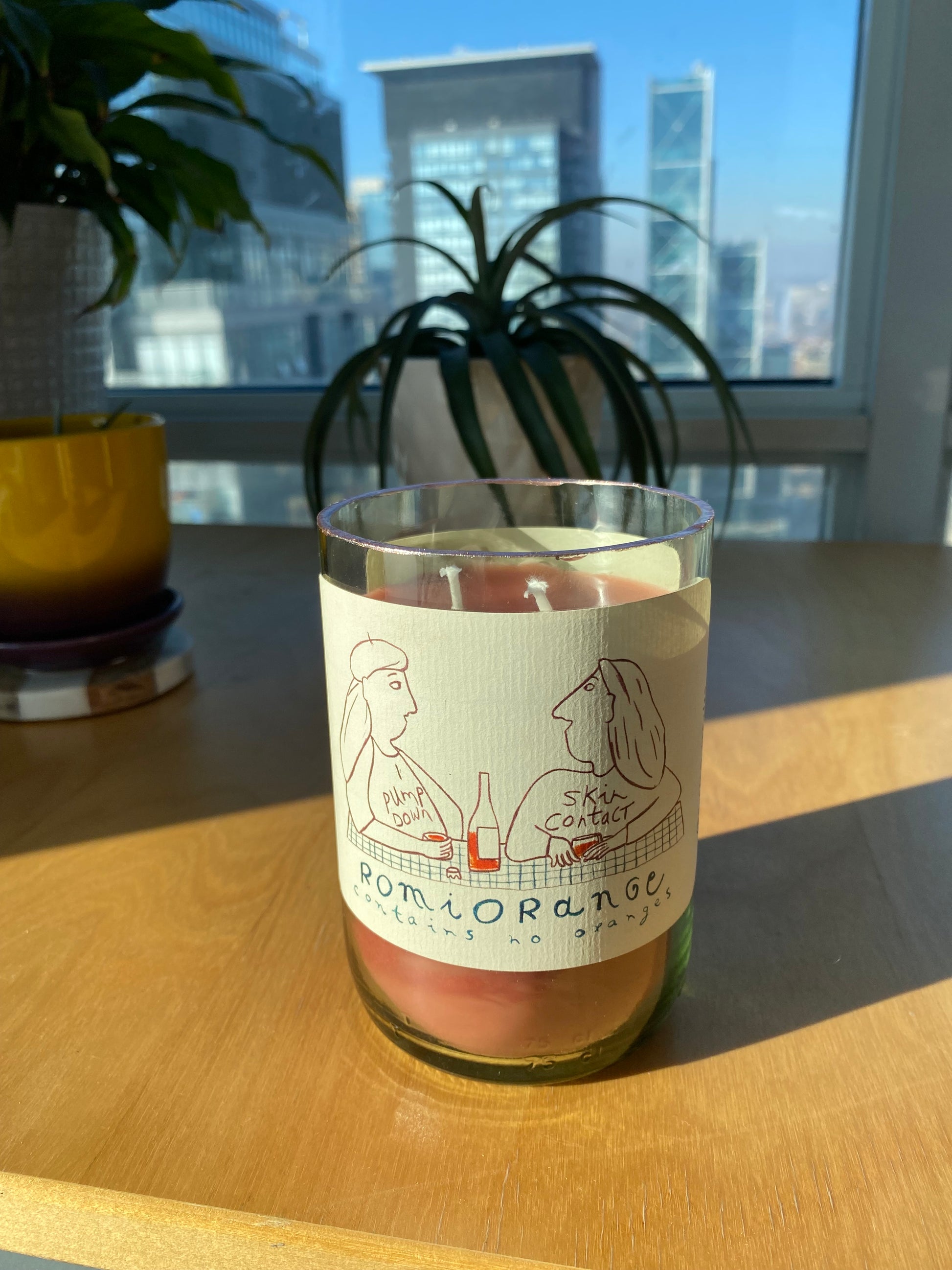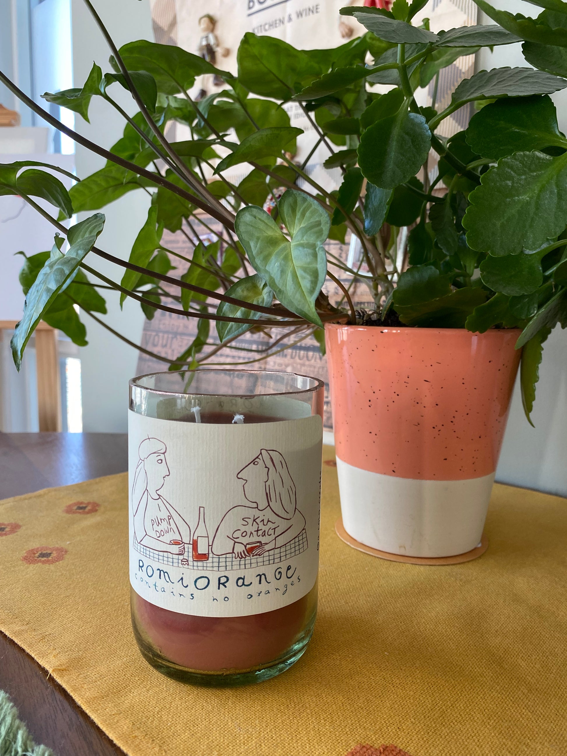 Two friends vibing with orange skin contact wine. Chef's kiss! Super cute label on a gold rimmed wine bottle. 2 wicks in a warm burgundy wax with spicy cinnamon scent.